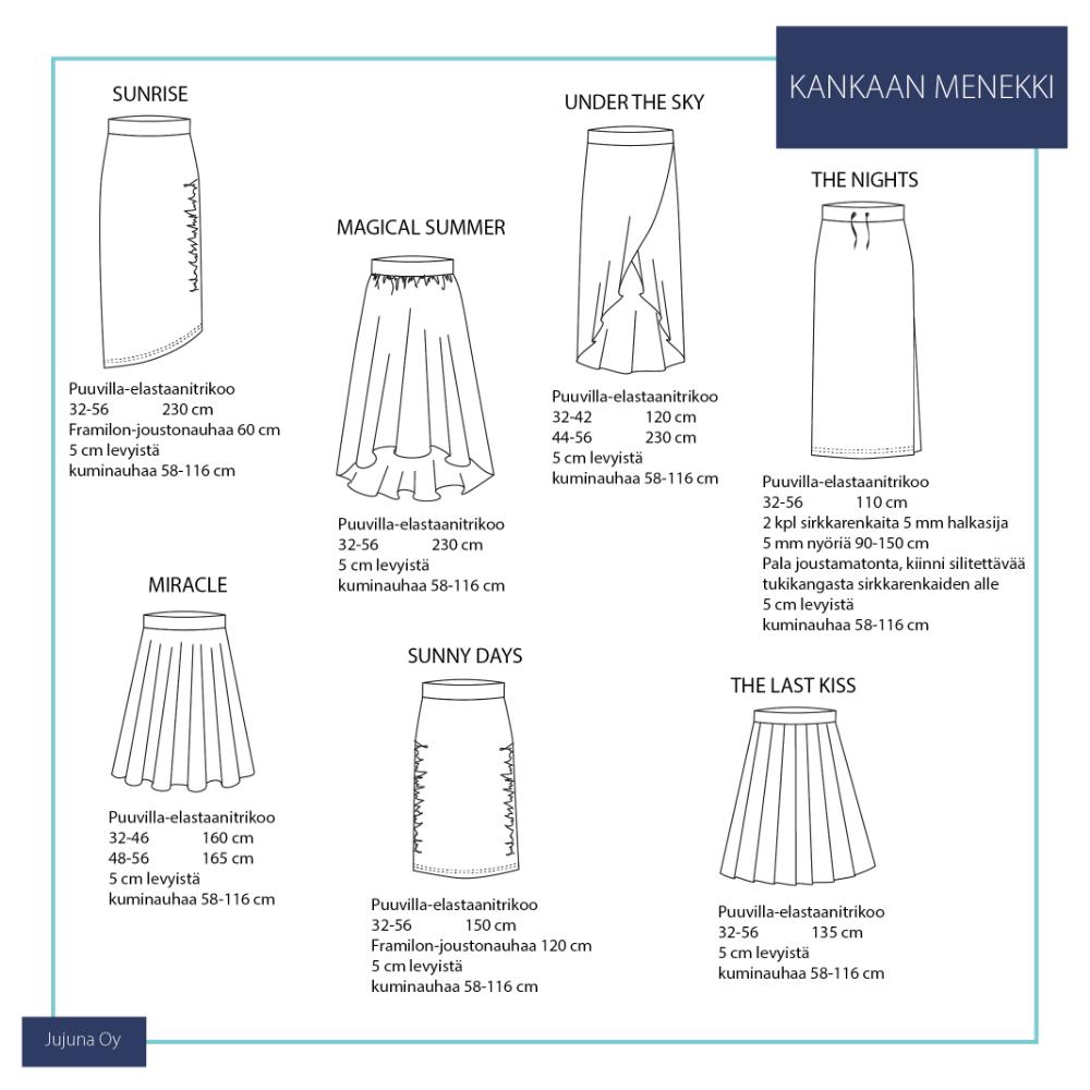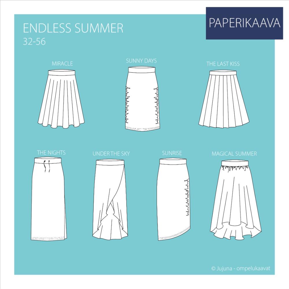Endless Summeri lõigete inspiratsiooniallikaks on olnud pikad, pöörased ja lõbusad detailid. Seelikud sobivad hästi igapäevaseks kasutamiseks ja erinevateks puhkudeks. Kui otsite pidulikumat mudelit, siis Miracle and Magical Summer sobivad suurepäraselt korralikuma ja pidulikuma särgiga. Kas vajate ehk seelikut rahulikumaks linnareisiks või õhtuseks väljasõiduks? The Nights ja Under The Sky sobivad ideaalselt selleks otstarbeks.