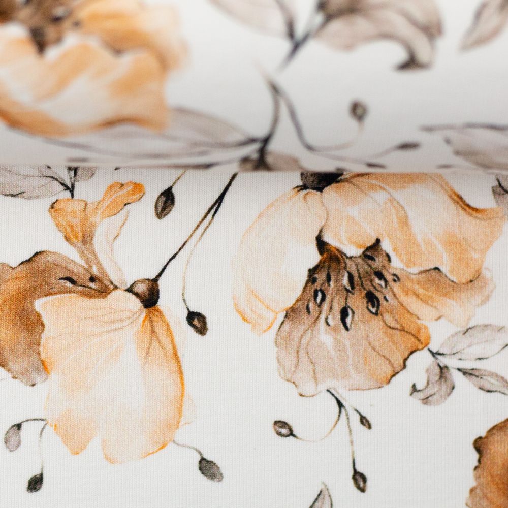 Trikotaaž – aprikoosivärvides lilled, 1,1 meetrine tükk
