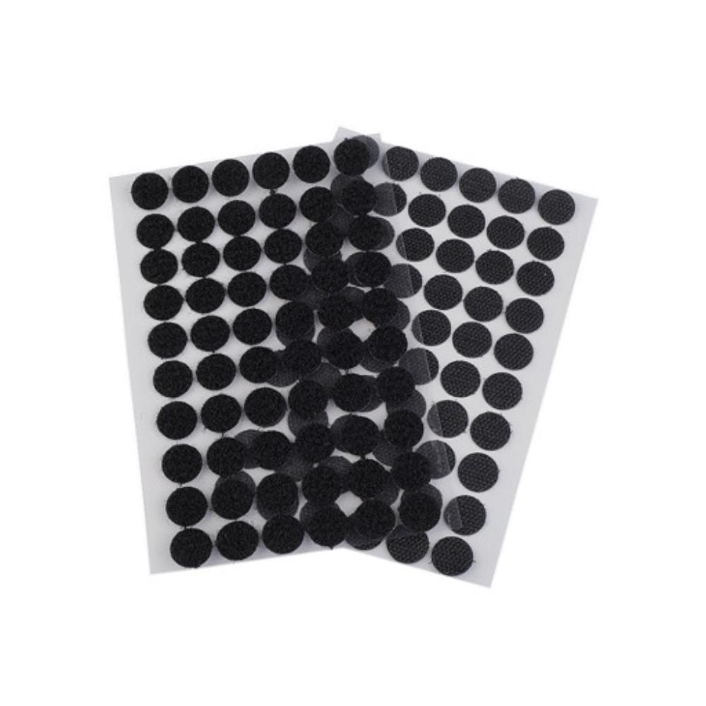 Liimitav takjakinnitus, ühe kinnituse läbimõõt on 15 mm, pakis on 60 kinnitust, mõlemad pooled on kangale liimitavad.