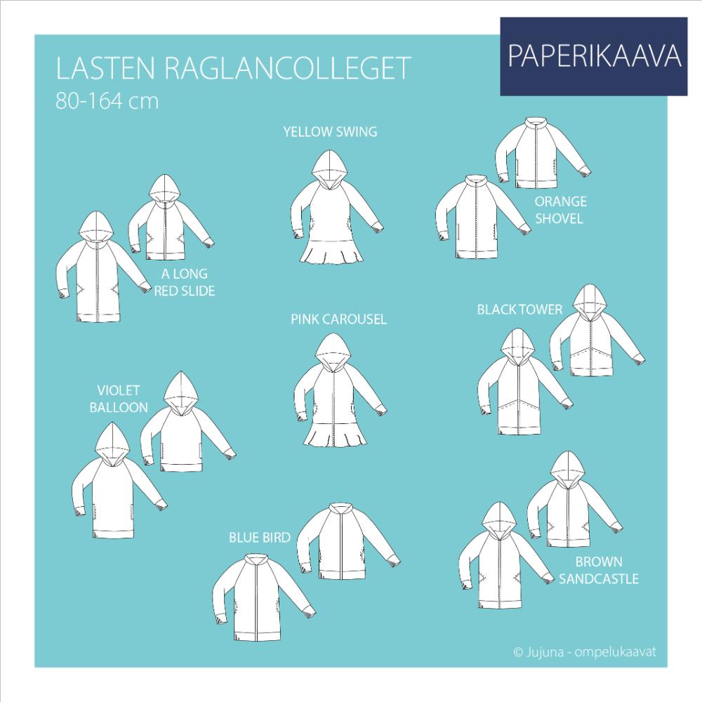 Laste raglaanlõikega komplektis on 8 erinevat mudelit. Lõigete erinevaid osi saab omavahel kombineerida ja saada veel palju imelisemaid kujundusi.