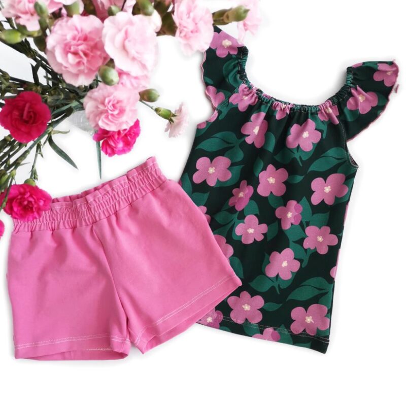 Komplektis on satsidega pluusid ja lühikesed püksid.
