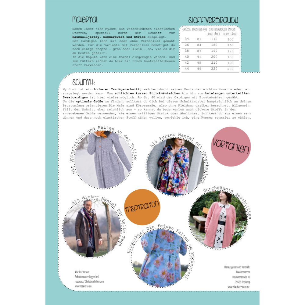 Lõike alusel on võimalik õmmelda kas avaram kardigan või taljesse töödeldud mantel, jakk, jope. Samuti on võimalik kombineerida kapuutsi ning toote pikkusega.