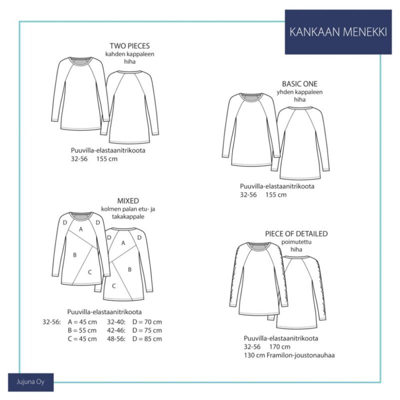 Komplekt sisaldab sobivaid esi- ja seljatükke mitmete õmblustega ja ilma õmblusteta. Lisaks on kolm erinevat tüüpi varrukat: tavaline raglaanvarrukas, kaheosaline raglaanvarrukas ja kaheosaline raglaanvarrukas, mille keskel on ilusaks detailiks kortsuke. Vöökoht on mustril märgitud horisontaalse joonega. Täiendav juhis võimaldab teil kohandada seljaosa pikkust vastavalt teie vajadustele.