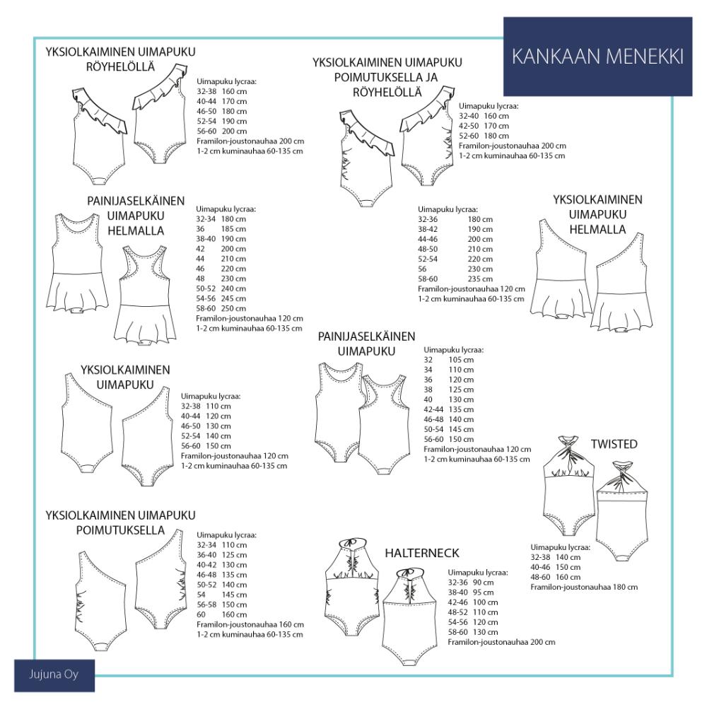 Naiste ujumistrikoode komplekt sisaldab 9 erinevat ujumistrikoo mustrit suurustes 32-60.