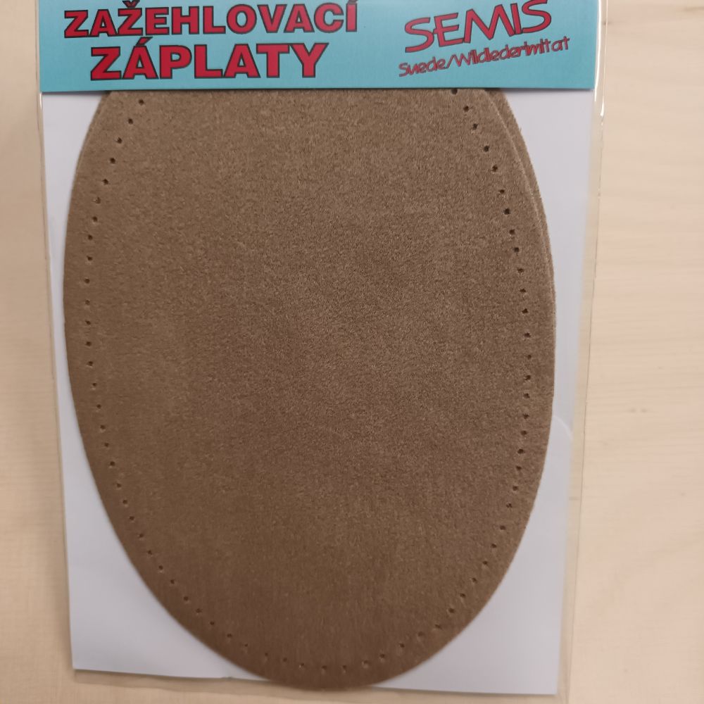 Triigitav ehk kuumkinnituv seemisnaha imitatsiooniga paik suurusega 9,5 x 14 cm.