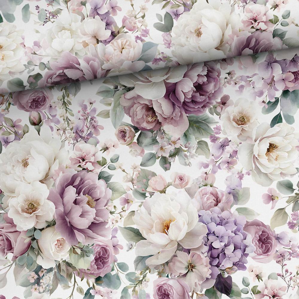 Trikotaaž – valged ja lillad pojengid ja hortensiad