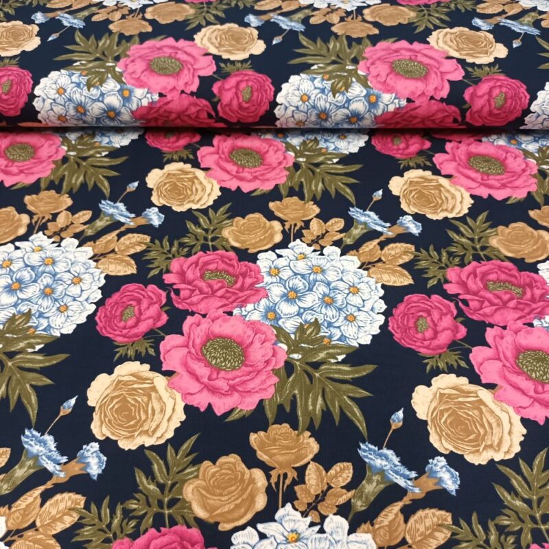 Trikotaaž – sinised ja mustad lilled loodusvalgel
